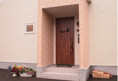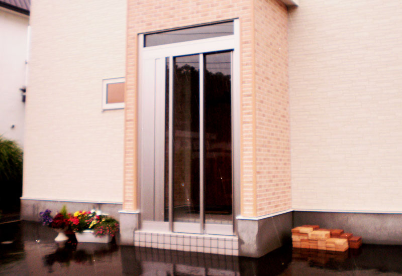 風除室を取付したいとの事で、相談を受け、下レールの無い2枚引き込み戸をお勧めし施工しました。 夏季の暑さ対策に換気ユニット(網戸付き)をオプションで、取付しました。 写真は、網戸の開いた状態です。